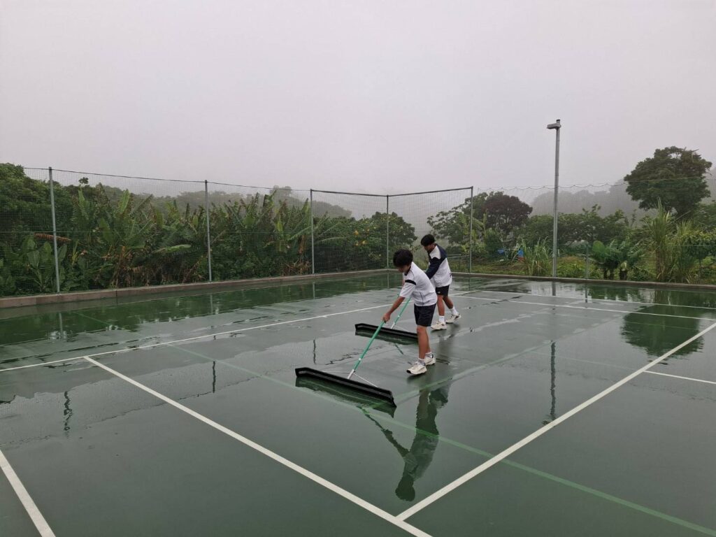 雨上がりのコート整備 管理人便り 2026.04.06 私が子供の頃、通っていたテニスクラブはハードコートで奥武山、漫湖コートともにハードコートの時代でしたから雨上がりの水はき作業はみんなお手の物でしたが、、、今の子は周りがほとんどオムニコートなんでみんな未経験でまともに水を捕まえることもできない。田村コーチもできなかったのにはちょっとびっくり・・・(^^;)まあいい経験だし、これからはハードコートでの機会が増えてくると思うからこれも習得してもらいましょ。はよせんと練習時間なくなるぞ~(^^)